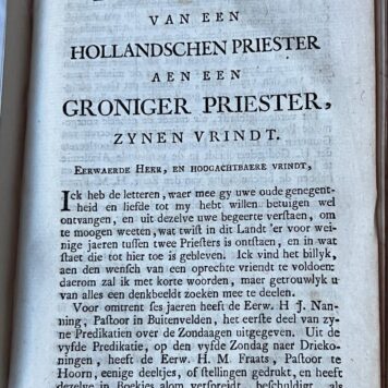 [2] Twee predikatien op den jaarlykschen gedenkdag van het wonder der Heilige Stede gedaan binnen Amsteldam door J.N., Amsteldam Th. Krajenschot 1750, (10)+60 pp. met frontispice door C.F. Fritzch met theologische scenes en afbeelding van Amsterdam vanaf het IJ in het midden, op de titelpagina een titelvignet. [3] Brief van Desiderius Erasmus van Rotterdam aan Koenraad Pelikaan bevattende zyn gevoelen wegens het Heilig Avondmaal des Heeren mitsgaders twee predikatien onlangs over dezelfde Stoffe gedaan, Amsteldam Gerrit Tielenburg [s.d], 12+36 pp. [4] Godsvrugtige zangen op de voornaamste feesten door J.N., Amsteldam Theodorus Crajenschot, 1756, 63+(1) pp. Met grote frontispice met wolkenscene. Het register achterin “Tafel” ondertekend door de uitgever Th. Crajenschot. [5] Refugium peccatoris ad Jesum Christum. Amsterdam, Crajenschot, 1756. [14] pp. [6] Betoog der regtzinnige leringe van J.N. aangerand door M.F. r.p., Amsterdam Theodorus Crajenschot 1755, 22+(2) pp. [7] Breve of Brief, van onzen alderheiligsten vader den Paus Benedictus den XIV (14e) aan de rector en hoogleraars der vermaarde universteit van Leuven geschreeven en gedagteekend te Rome op den IX April 1757, 7 pp. [8] Brief van een Hollandschen priester aen een Groniger priester, zynen vrindt, 1758, 4 pp. [9] Fidelis Copia, 2 pp. [10] Getrouw afschrift van de gantsche besluit en antwoordt van Rome, in de zaeke tusschen der Eerw. H.N. en de Eerw. H.F. betwist, 2 pp.