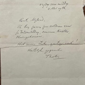 Letter 3: Total size 25 x 15 cm. Signed: Vrijdagmiddag 4 mei 1928: Beste Nijland, Ik ben zo even zeer voldaan je tentoonstelling, museum Kröller, thuisgekomen. Het mooie, sterke, geestige werk! Hartelijk gegroet, Tholen. Letter with a tear in the middle, therefore two loose parts. On the back the address: Dirk Nijland, kunstschilder, Jagerslaan 4 Wassenaar. With stamp 7 1/2 cent and stamp: Postzegels rechts boven in den hoek, vlugger verzending and the date 1928.