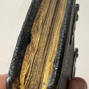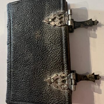 Full shark leather binding with two silver clasps. The leather a bit withened on the side of the silver clasps. Binding further in good condition. Guilt edges. Interior in good condition. In -24, 7,5 x 4,5 cm. With 6 special prepared pages in order to be able to write and delete notes. The thicker paper has some scribbles.