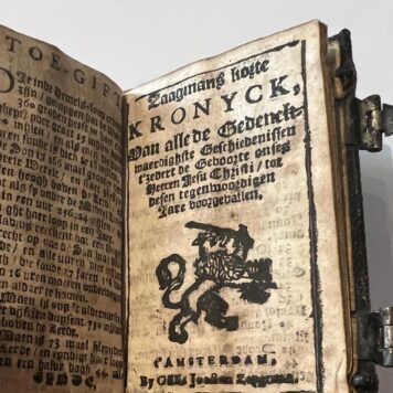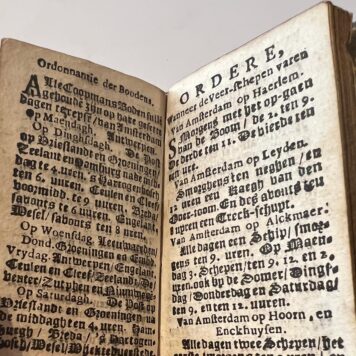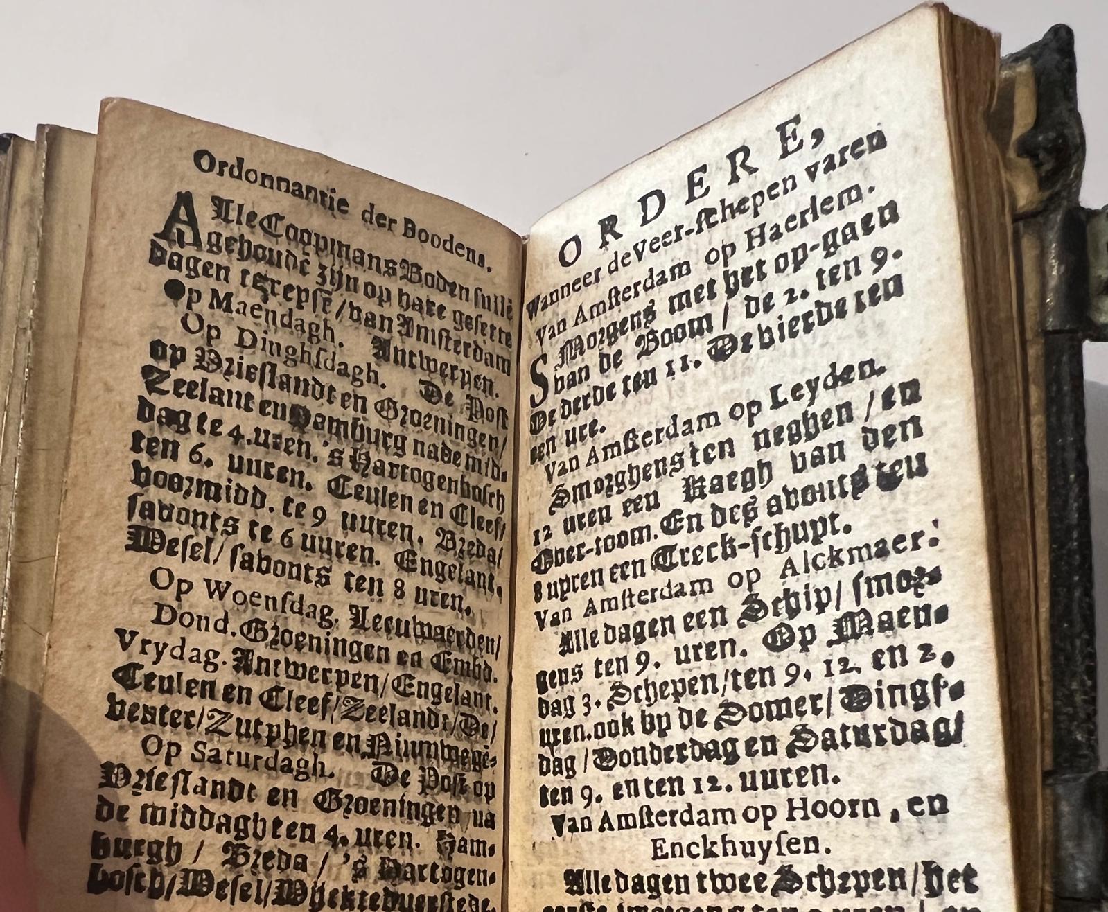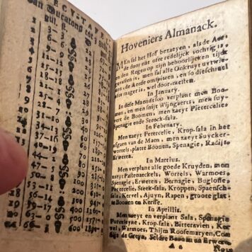 With: Calender printed in red and black ink (each month with a woodcut), Eclipsen, Tijt-wyser veerschepen /trek-schuyten en wagens, ordonnantie der boodens, poortklokken, De Italiaensche waer-segger 1686 Dr. Antoni Magino, professoor tot Milanen, Hoveniers almanach with a woodcut of a sowing gardener (and Hoveniers Almanack), poortklokken Gouda en Leiden and Zaagmans korte kronyck.