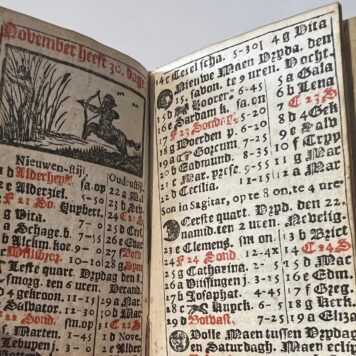 Almanac 1686 | Zaagmans Almanach na de nieuwe en oude stijl op ‘t jaer onses heeren (…) 1686 (…) door P.R. van Nierop, by Gillis Joosten Zaagman [Amsterdam, 1685]. With 2 gardeners’ almanacs. Miniature, in – 24 size.