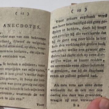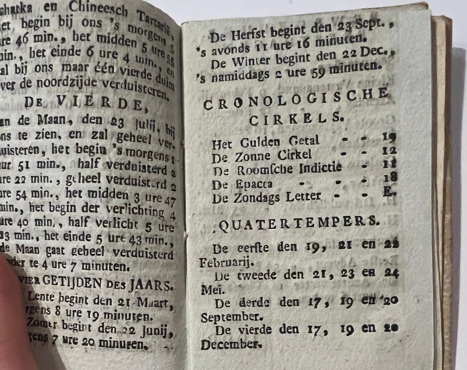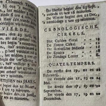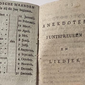 [NL] Mooie kleine almanak gedrukt in Leeuwarden met Chronologische cirkels, Quatertempers, kalender van het jaar per maand, Joodsche maanden. Aan het eind toegevoegd: Anekdotes Puntspreuken en liedjes. Op de titelpagina staat Elte Martens Beima (1801-1873) genoemd. Hij is een astronoom en wiskundige uit Friesland. In 1822 begon hij voor het eerst een almanak uit te geven waarin berekeningen en tekeningen van eclipsen verschenen. De gouverneur van Friesland raakte geïnteresseerd in zijn werk, wat leidde tot Beima’s studie in Leiden in 1824. Hij promoveerde te Leiden op een proefschrift over de ringen van Saturnus (“Annulo Saturni”) en publiceerde hierover later onder de titel Verhandeling over den ring van Saturnus in 1843. In 1821 was Beima al genoemd als medewerker van de “Vriesche Almanak,” waarbij hij de rubriek “Sterrenkunde” verzorgde. Beima was oud conservator van ‘s Rijks Museum van Natuurlijke Historie te Leiden en wel in vak van mineralogie en geologie. Hij zorgde voor een bijzondere bibliotheek, gebaseerd op het kabinet van de beroemde Bruckman te Brunswijk.