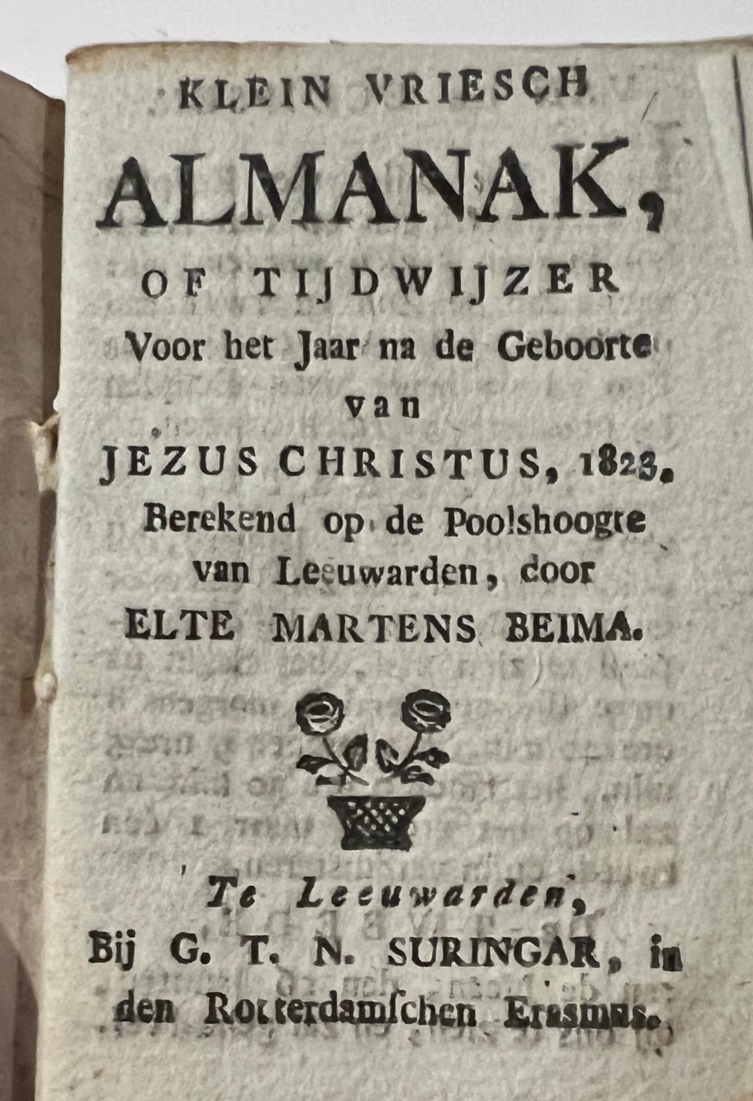 Almanac 1823 | Klein Vriesch almanak, of tijdwijzer voor (…) 1823. Berekend op poolshoogte van Leeuwarden, door Elte Martens Beima, Leeuwarden G.T.N. Suringar in den Rotterdamschen Erasmus [1823], 32 pp.