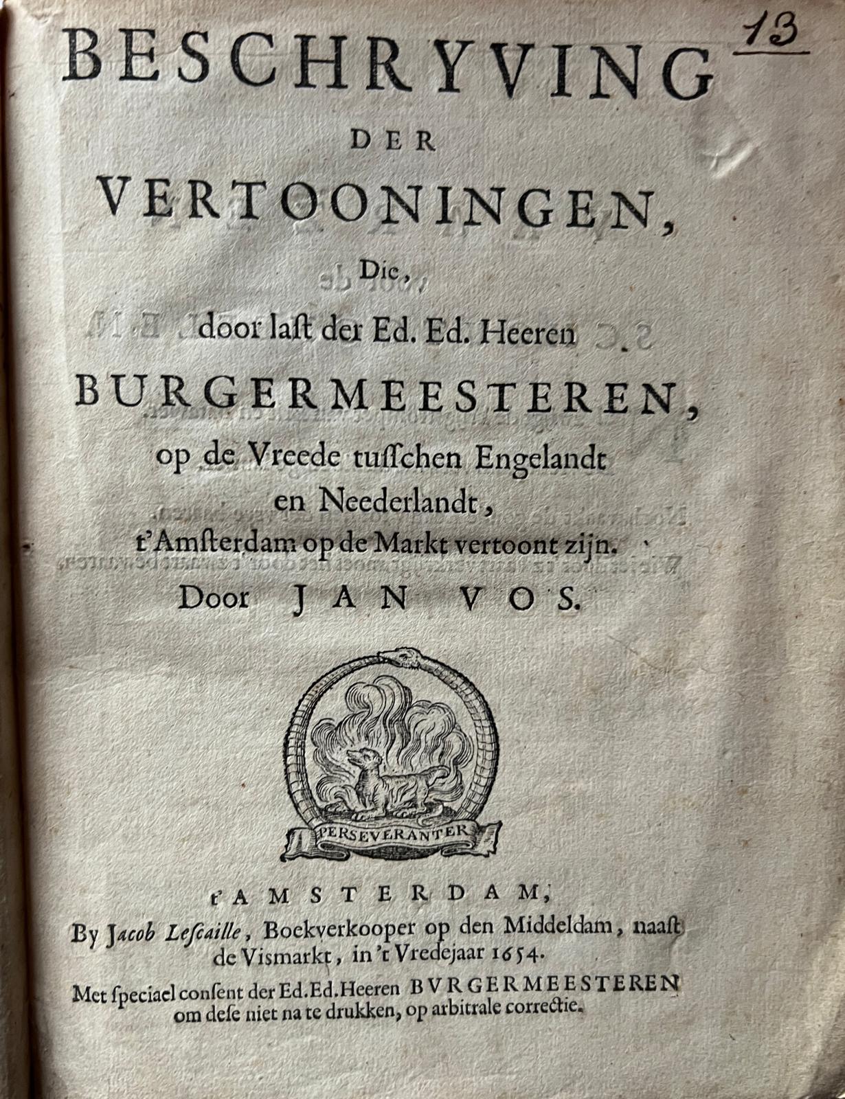 Amsterdam spectacle theatre 1654 | Jan Vos: Beschryving der Vertooningen, (…) op de Vreede tusschen Engelandt en Neederlandt, ‘t Amsterdam op de Markt vertoont zijn, Amsterdam Jacob Lescailje 1654, [16] pp.