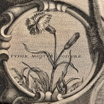 Portrait of Maria Gonzaga, duchess of Nivers, then queen of Poland and Grand Duchess of Lithuania (1611-1667). Half-length, seated, bust turned to the left, head frontal, gazing at the viewer, holding a flower in her left hand a and a fan in the other. Pearls and jewels decorating her dress. Wearing a crown, mantle lined with ermine and powdered with fleur de lys. Decorative frame with circular elements containing flowers and mottos in Latin; cartouche at bottom inscribed: MARIAE PRINCIPI MANTUANAE DUVCISSAE NIVERNENSI &.