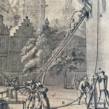 Sheet with a large representation of the application of the new fire hoses by Jan van der Heyden and Jan van der Heyden II to extinguish a fire hitting a building in an imaginary city. At the top two cartouches with the titles in Dutch and French. At the bottom four small representations of fires in houses and on a ship and a model of the pump. In between, the legend A-M in Dutch and French. A text is printed on the sheet below the plate with a description in 4 columns in Dutch and French. The sheet belongs to the supplements to the fire hose book by Jan van der Heyden (1690).