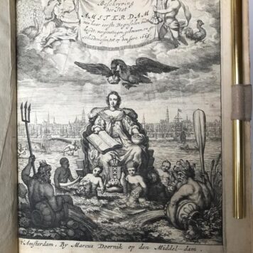 This richly illustrated tome chronicles the history of Amsterdam, from its original settlement on the river Amstel through the construction of the dam that established Amsterdam (Amstelredamme), to the growing city’s relationship with the surrounding region. Images and text chronicle a range of historical events and topics through the year of the book’s publication, including military and colonial enterprise, Anabaptist revolts, architectural landmarks, and unusual natural phenomena (e.g. the passage of a comet in 1664, followed shortly thereafter by a dramatic ice storm in Amsterdam). Six books are accompanied by a record of all men registered to the city between 1333 and 1665, as well as an alphabetized index.