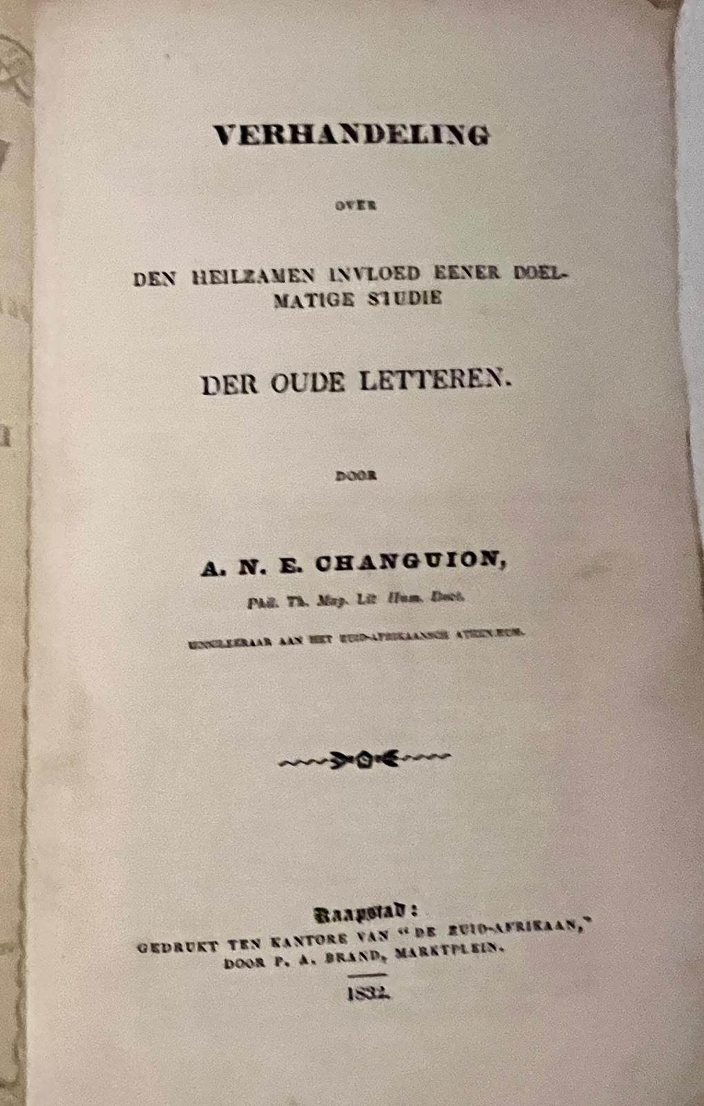 Education classics 1832 | Verhandeling over den heilzamen invloed eener doelmatige studie der oude letteren, Kaapstad, gedrukt ter kantore van ” De Zuid-Afrikaan”. door P.A. Brand 1832, 32 pp. With illustration of Zuid-Afrikaansch Athenaeum.