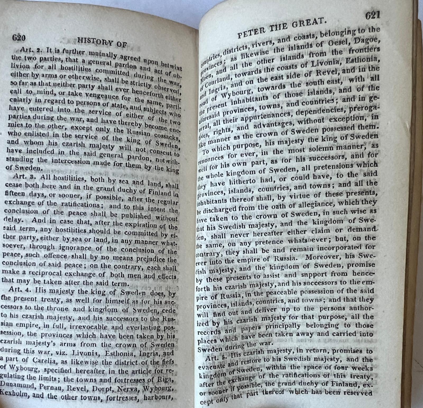 Combined history of Sweden and Russia with the hero’s Peter the Great (1672-1725, famous ruler of Russia) and Charles XII (1682-1718, famous warrior king) in the main role. Translated by Tobias Smollett (1721-1771), Scottish author, poet, translator and surgeon. Text in English.