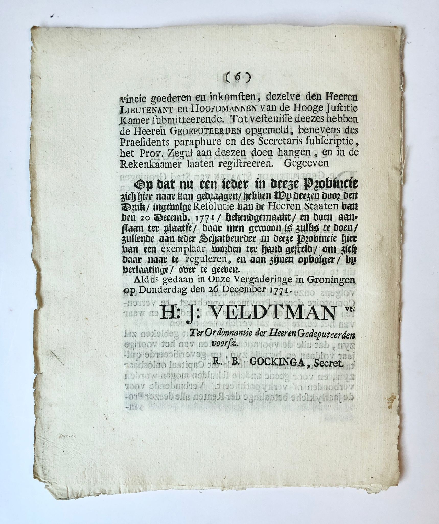 [Groningen, Baggeren, dredging 1772] Reglement op de Baggelaaryen of ontgrondige van Landen in de Provincie van Stad en Lande, by Jacob Bolt, Te Groningen, 1772, No. 48, 6 pp.