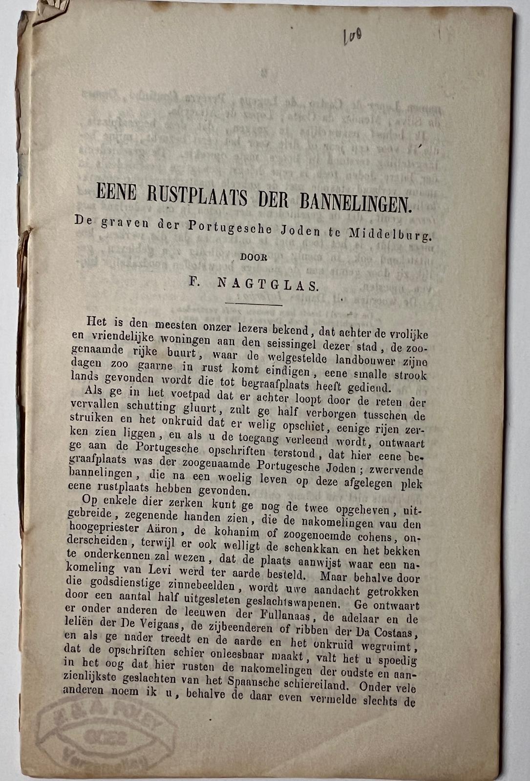 Judaica Zeeland 1864 | Rustplaats der bannelingen. De graven der Portugeesche Joden te Middelburg, overdruk Zeeuwsch Jaarboekje en Middelburgsche Naamwijzer 1864, 20 pp.