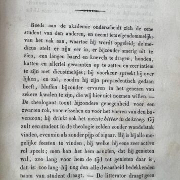 Typologieën die als een “follow-up” kunnen worden beschouwd van Kneppelhouts studentenschetsen die van 1841 tot 1844 waren verschenen. De auteur is Jan de Vries (Amsterdam 1819 – Antwerpen 1855), aanvankelijk schrijver van veelgelezen, maar door de kritiek (en later door de literatuurhistorici) volledig genegeerde historische en realistische romans, in later jaren een van de belangrijkste radicale journalisten van de negentiende eeuw. In 1854 werd De Vries tot 3 jaar gevangenisstraf veroordeeld wegens majesteitsschennis, maar die straf is nooit ten uitvoer gelegd, omdat hij in 1855, na een jaar schuldgijzeling in Antwerpen “lichamelijk en geestelijk opgebrand, één week voor zijn 36ste verjaardag” (Luger) kwam te overlijden. In ‘Na het studentenleven’ worden beschreven: De proponent, de dorpspredikant, de doctor, de advocaat en de rector, en de ex-student. In zijn beschrijving van dat laatste type zal De Vries ongetwijfeld de ervaringen hebben verwerkt die hij had opgedaan tijdens zijn (mislukte) theologiestudie in Leiden. Van Doorninck II, 387 Luger, ‘Johan de Vries, student-autheur te Leiden’, in: Wie las wat in de negentiende eeuw (Utrecht 1997); Robijns, Radicalen in Nederland (1840-1851) (Leiden 1967); Vinken, ‘Jan de Vries, pamflettist, 1819-1855’, in: Tirade 49 (2005), p. 109-127; F & vd B p.858.