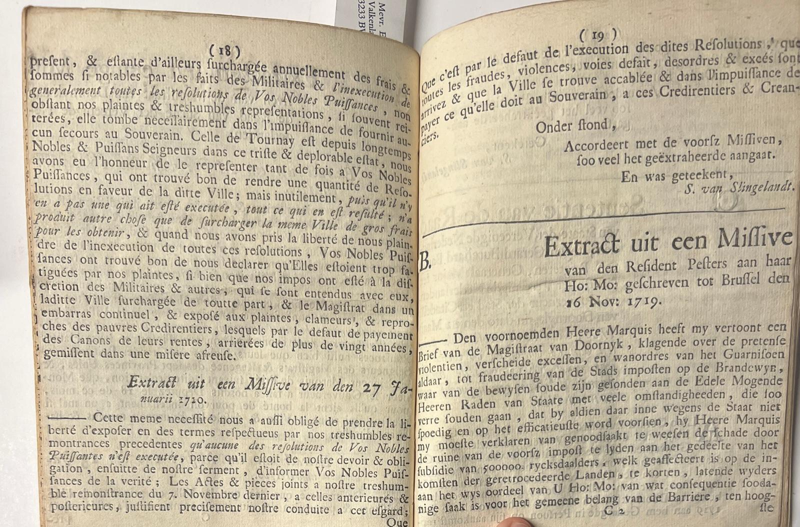 Full title: Missive van den Raad van Staate der Vereenighde Nederlanden aan Haar Ho. Mo., raakende de sententie, den 22 Maart 1720 gewesen, tegen Gerard Burchard baron van Regteren, generaal majoor ten dienste der Ver. Nederlanden en gouverneur van Doornyk, en de memorie daar tegen overgegeven aan haar Ho. Mo. den 11 April 1720 door Adolph Hendrik graaf van Regteren etc., met eenige bijlagen. ‘s-Gravenhage, P. Scheltus, 1720.