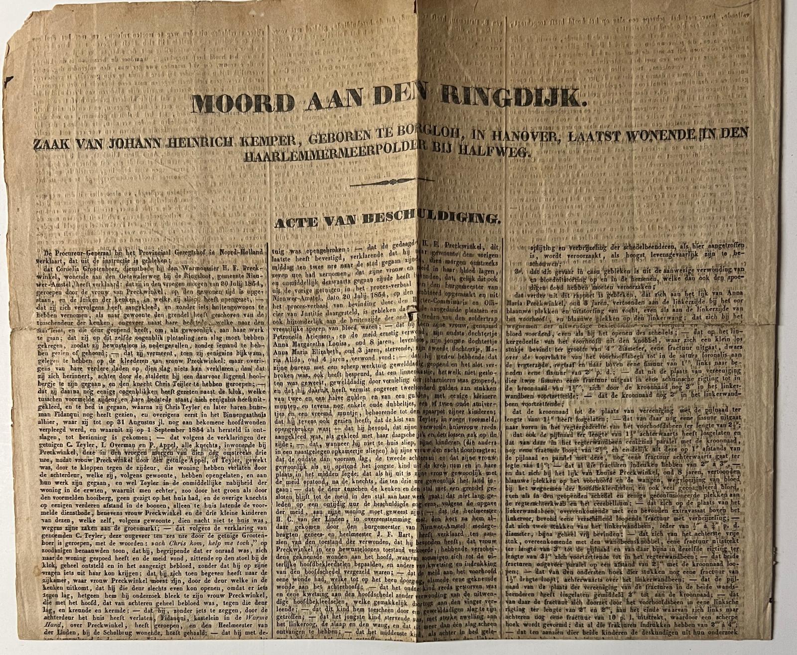 Criminality Haarlem 1854 | Moord aan den Ringdijk. Zaak van Johann Heinrich Kemper, geboren te Borgloh in Hanover, laatst wonende in den Haarlemmermeerpolder bij Halfweg. Acte van beschuldiging. [Amsterdam, drukkerij Algemeen Handelsblad] [1854].