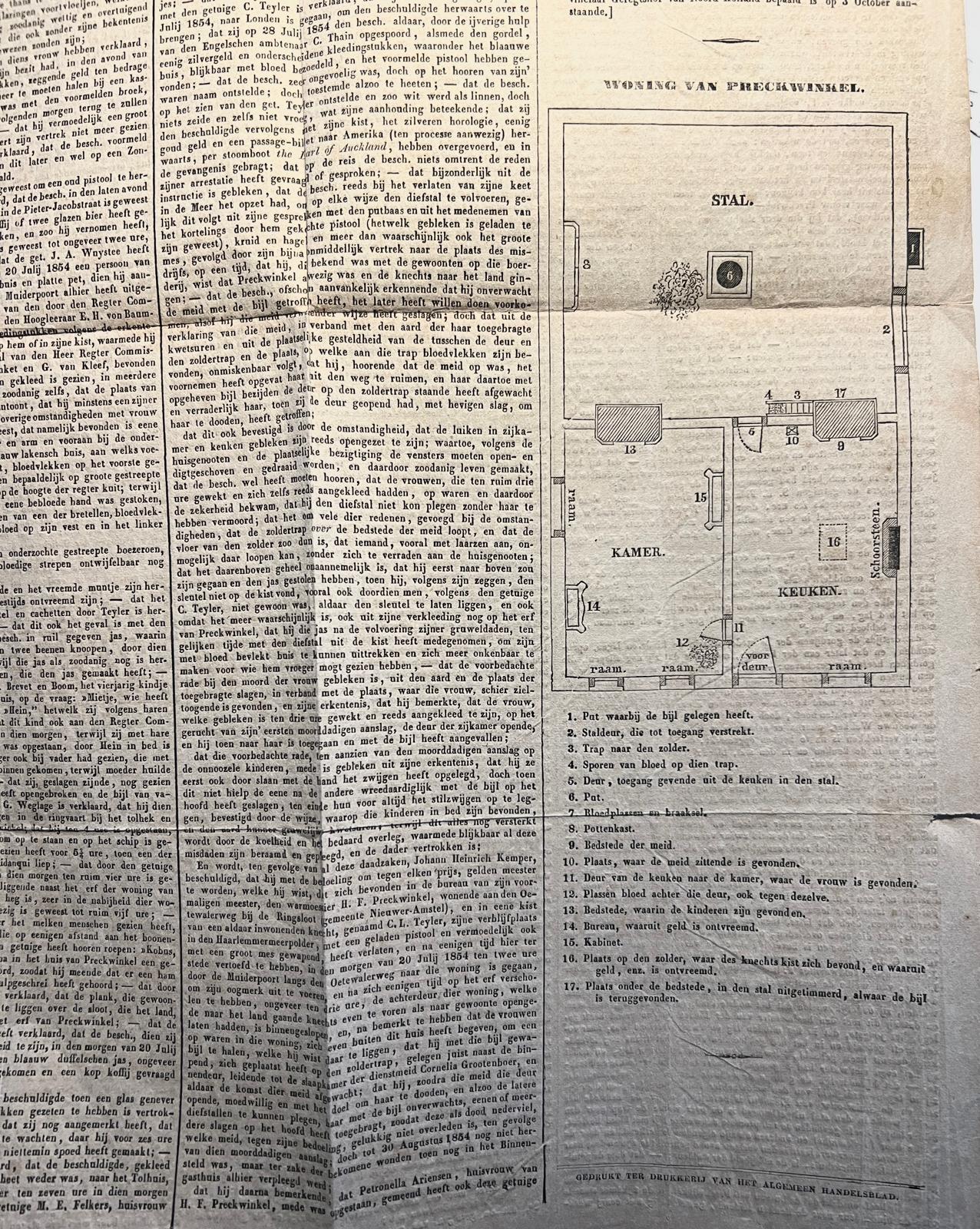[NL] In de acte de toedracht van de moord: Op 20 juli 1854 werd de zwangere vrouw van de warmoezier H.F. Preckwinkel, geboren Petronella Ariensen, wonende aan de Oetewalerweg bij de Ringsloot, gemeente Nieuwer Amstel, vermoord gevonden, evenals 2 van haar drie kinderen: de 8 jarige Anna M.L. en de 3 jarige Anna M.E. Getuigen: de dienstbode Cornelia Grootenboer, de knechts Chris Teijler, I. Overman en P. Appel, de buurman S.B. Fidanqui (kastelein in De Warme Hand), vrouw L. van Dijk, wed. J.F. Wakker, vrouw G.J. van Doorn, vrouw van H.J. Wiegand en vrouw B. Boelhouwer, wed. J. Elsman. Hein Kemper, vroeger werkzaam voor Preckwinkel, wonende in een keet in de Haarlemmermeerpolder bleek de dader, met als oogmerk diefstal van geld en kostbaarheden. Hij vertrok via Den Helder naar Londen, met het doel om naar New York te reizen, maar werd in Londen gepakt en naar Nederland teruggebracht. Getuigen: C. Klaverland, A. Libert, tapper Bierman, J.A. Wuystee, Blanket, G. van Kleef, J.R. Sachtleben, J.G. Weglage, D. Tewisser, H. Boven.