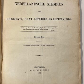 Complete set van 6 uniforme rood kartonnen banden. Gebonden afleveringen van de Nederlandsche Stemmen over Godsdienst, Staat-, Geschied- en Letterkunde, een invloedrijk Nederlands tijdschrift dat verscheen tussen 1834 en 1838. Het bood een platform voor intellectuele discussies over religie, politiek, geschiedenis en literatuur in het Nederland van de vroeg 19e eeuw.