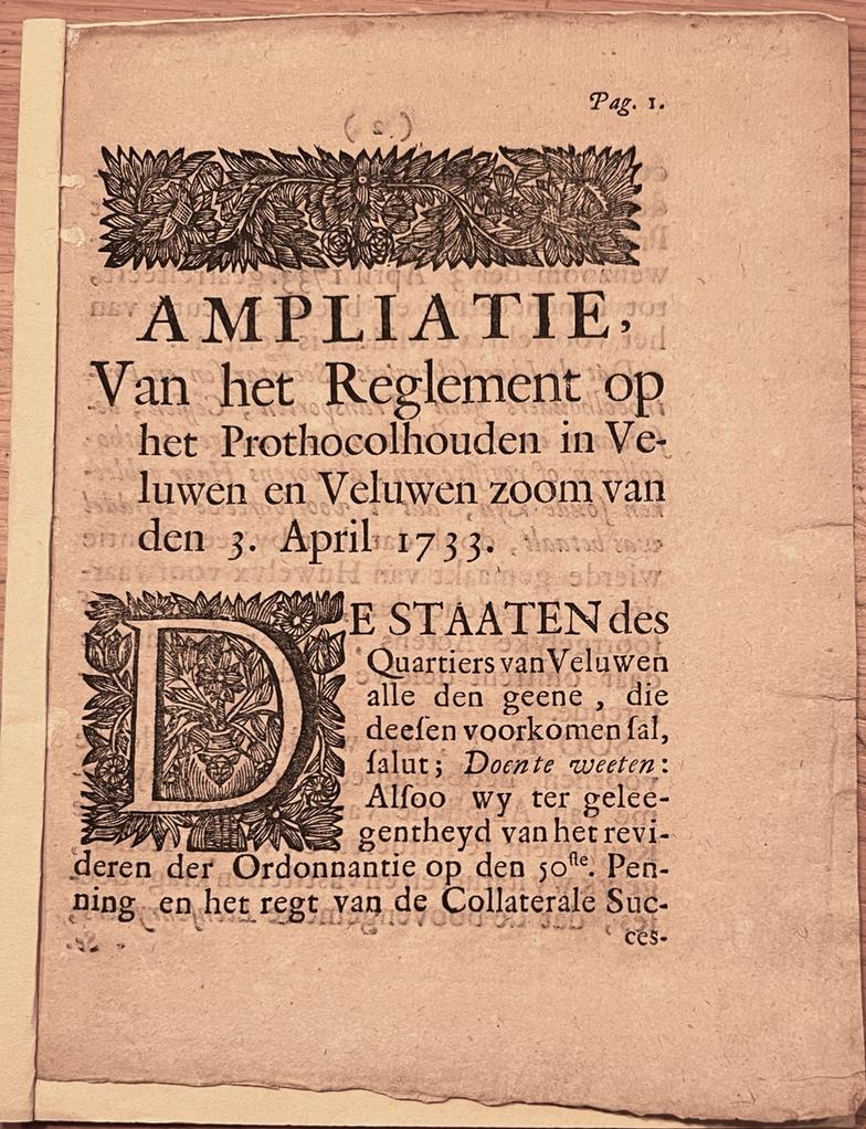 [Pamphlet, Veluwe, 1750] Ampliatie, van het Reglement op het Prothocolhouden in Veluwen en Veluwen zoom van den 3 April 1733, by de wed. van Hendrik van Goor, t’ Arnhem, 1750, 4 pp.