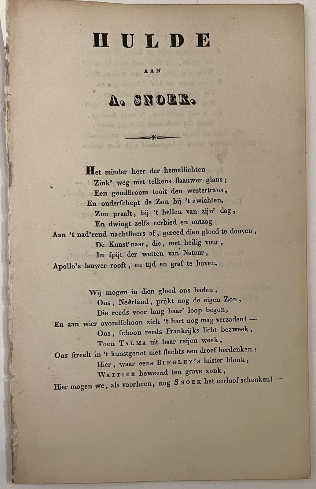 Poetry music 1828 | Hulde aan A. Snoek, [s.n.] ‘s Gravenhage 3 junij 1828, signed by A. Beeloo, 2 p.