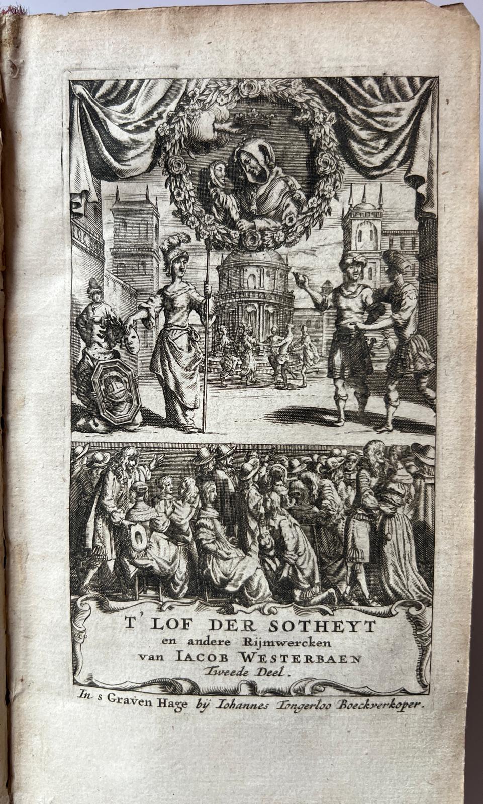 Content volume II: Het tweede deel der Gedichten (Lof der Sotheyd, De vi. Comedien van Terentius, Senecaas Troas, II Avond-Schoolen, Farrago Latina). With engraved title-page ‘T Lof der Sotheyt en andere Rijmwercken. Including the poem “Aan de Haegse Vryers”, aan de Haagse vrijers.