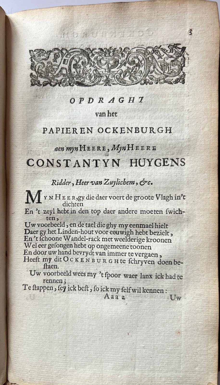 Content volume I: Eerste deel der Gedichten (minne-dichten, Brieven van Doorluchtige vrouwen, Helden-Dichten, Mengel-dichten Ockenburgh), Ockenburgh, including engraved portrait of Westerbaen by Visscher and folding engraving of Ockenburgh.