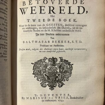 [NL] Explosief boek tegen bijgeloof, demonen en heksen. Vier boeken in 1 perkamenten band. In goede conditie. Bekker fulmineert tegen de duivel als actief handelend wezen op aarde, boze geesten, spoken en bezetenheid en heksen en tovenaars en hun vermeende krachten. Hij doet dat op basis van Bijbeluitleg en de Cartesiaanse (Descartes) filosofie. De eerste editie uit Amsterdam dateert van 1693, daarna brak een pamflettenoorlog uit. Er verschenen honderden reacties in binnen- en buitenland. Bekker werd om dit boek uit zijn ambt gezet als predikant in 1692 en kreeg een proces aan zijn broek. Zijn kritiek op heksenwaan en duivelmacht wordt vaak gezien als een factor in het einde van heksenvervolgingen in de Noordelijke Nederlanden en als vroege stap richting onttovering / secularisering van het wereldbeeld. Deze latere Deventer druk bundelt de vier boeken in 1 band en is aangepast aan de 18e eeuwse mode: titelpagina in rood en zwarte inkt en een andere Titel-plaat gemaakt door J.C. Philips 1738 met een bijbelse voorstelling.